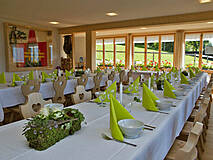 Une salle de restaurant confortable de 25 places ainsi qu'environ 80 places dans la salle panoramique avec une salle des alpages originale sont offertes dans une situation panoramique magnifique.